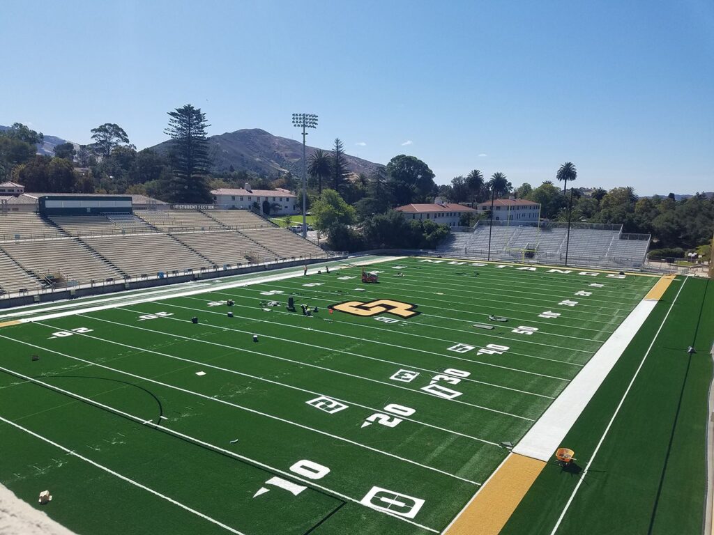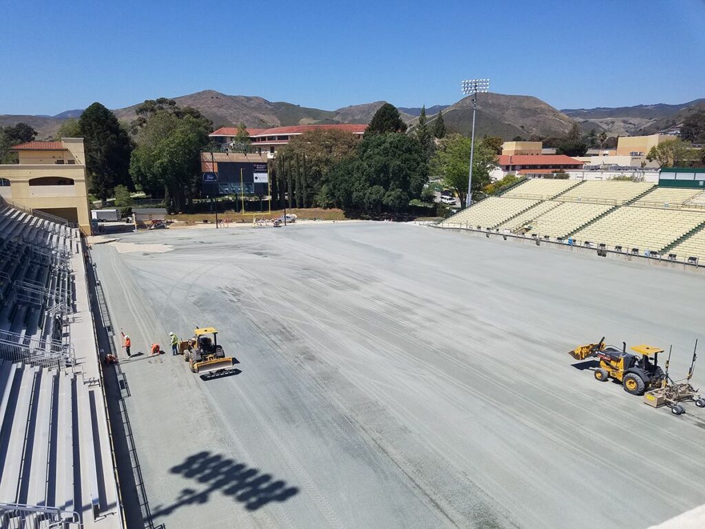Among the work completed was the complete removal of the existing natural grass, subgrade preparations which included leveling the field and adding as much as 2.5 feet of infill to the existing field, and improving the field accessibility with new concrete flatwork and curbs as well as installing storm drain and sanitary sewer upgrades. The stadium also got new field goals and posts.